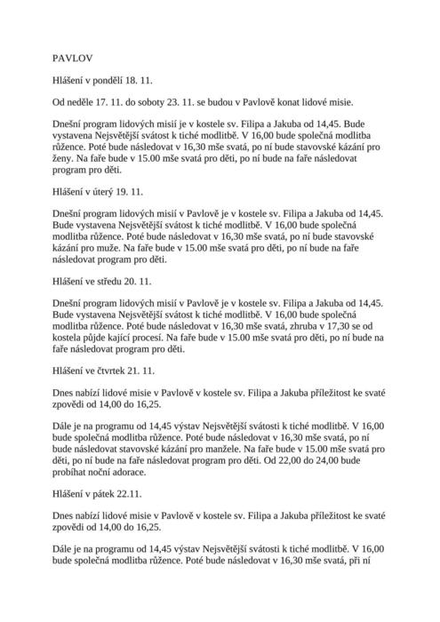 Dnešní program lidových misií v Pavlově je v kostele sv. Filipa a Jakuba od 14,45. Bude vystavena Nejsvětější svátost k tiché modlitbě. V 16,00 bude společná modlitba růžence. Poté bude následovat v 16,30 mše svatá, zhruba v 17,30 se od kostela půjde kající procesí. Na faře bude v 15.00 mše svatá pro děti, po ní bude na faře následovat program pro děti.