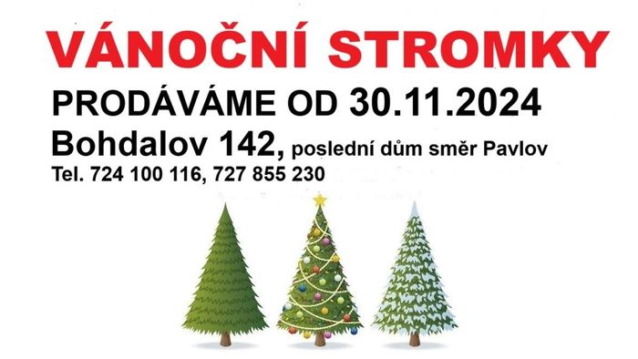 Pán Katolický z Bohdalova oznamuje, že od 30.11.2024 bude v Bohdalově prodávat vánoční stromky. Tel.číslo 724 100 116