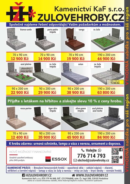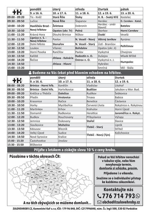 Žulovéhroby.cz oznamuje, že bude ve středu 11. a 18. 6. v 13:00 – 13:20 na hřbitově v Pavlově obchodní zástupce přijímat objednávky k opravám hrobů. Firma poskytuje veškeré kamenické práce.